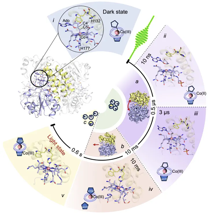 Photoreceptor proteins initiate, regulate and control fundamental biological processes such as vision, photosynthesis and circadian rhythms. A large photoreceptor subfamily uses vitamin B12 derivatives for light sensing, contrasting with the well-established mode of action of these organometallic derivatives in thermally activated enzymatic reactions. The molecular mechanism of B12 photoreception and how this differs to the thermal pathways remain unknown. Here we provide a detailed spatio-temporal description of photoactivation in the prototypical tetrameric B12 photoreceptor CarH from nanoseconds to seconds by using an integrative approach, combining time- and temperature-resolved structural and spectroscopic methods with quantum chemical calculations. High resolution structural snapshots of key intermediates illustrate how photocleavage of a Co–C bond triggers a pathway of structural changes that propagate throughout CarH from the B12 chromophore, via a previously unknown adduct, to finally cause tetramer dissociation. These unique intermediates, which differentiate CarH from thermally-activated B12 enzymes, steer the photoactivation pathway and act as the molecular bridge between photochemical and photobiological timescales. Our results offer a spatio-temporal understanding of CarH photoactivation and pave the way for designing and optimising B12-dependent photoreceptors for future optogenetic applications.